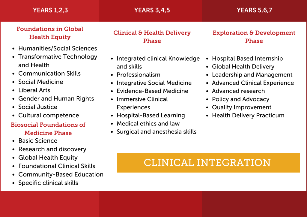 Although the MBBS-MGHD programme curriculum introduces several innovations, it is designed to build upon the existing curricular requirements for medical doctors in Rwanda and East Africa. MBBS-MGHD graduates will complete all of the same learning objectives as a graduate of any other medical school in the region. The individual phases of the programme are described below.