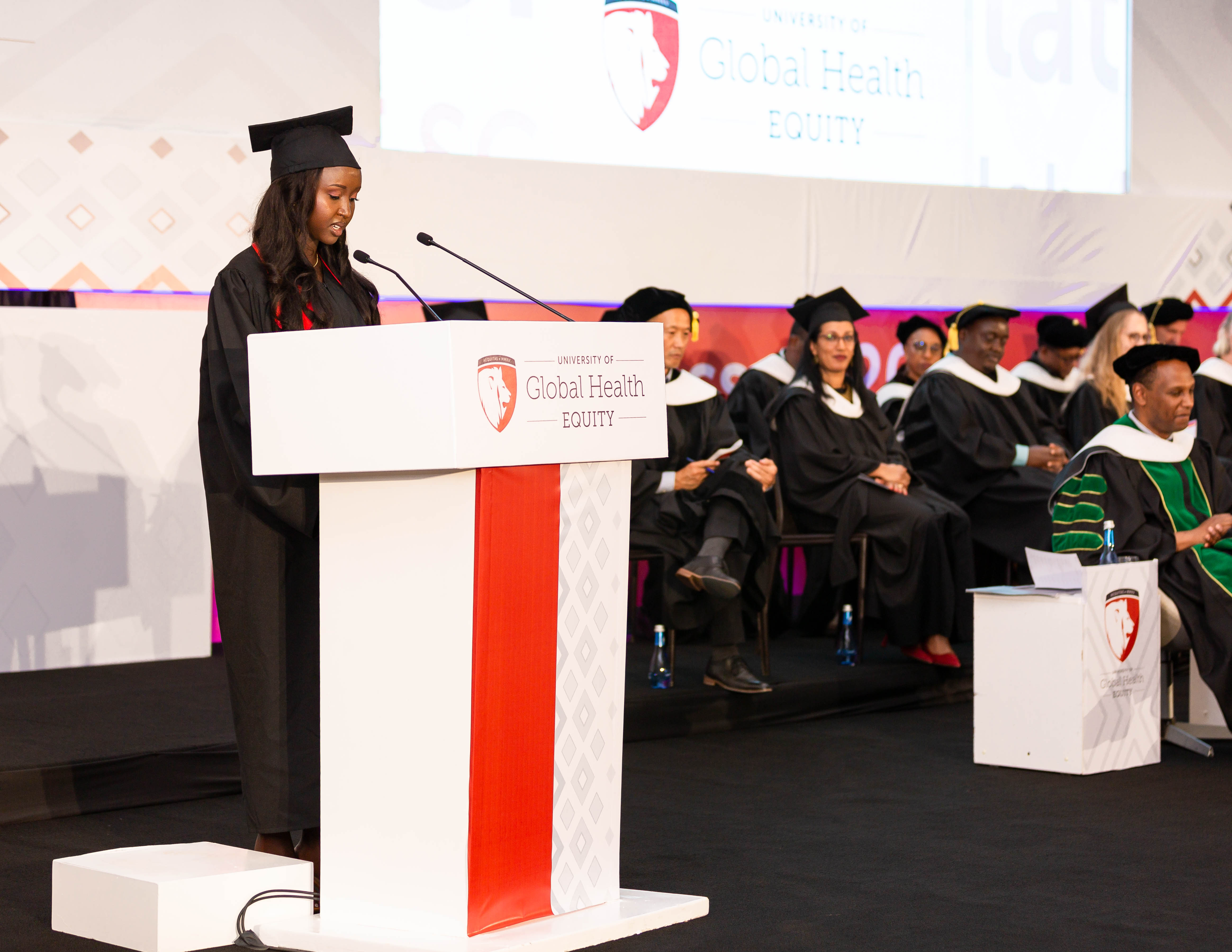 Ruth Zihiga Uwase, delivers a speech to represent MGHD’23 Graduates in One Health Track.