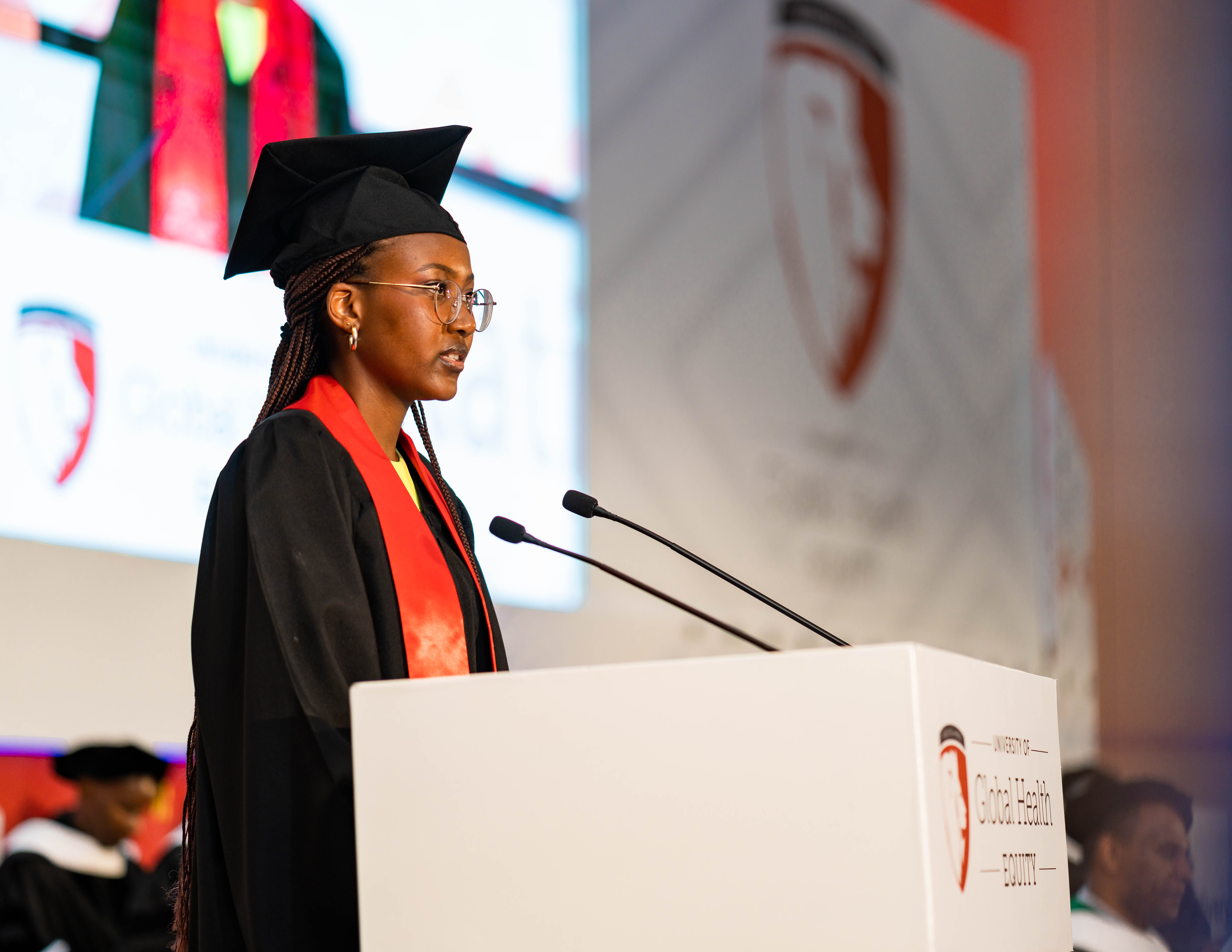 Ruth Zihiga Uwase, delivers a speech to represent MGHD’23 Graduates in One Health Track.