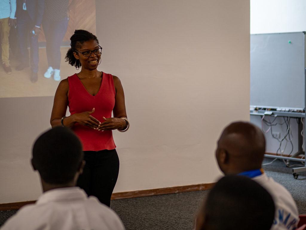 Dr. Zahirah McNatt, Godley-St. Goar Chair of the Department of Community Health and Social Medicine, welcomes students from G.S. Runaba Secondary School to Science Day.