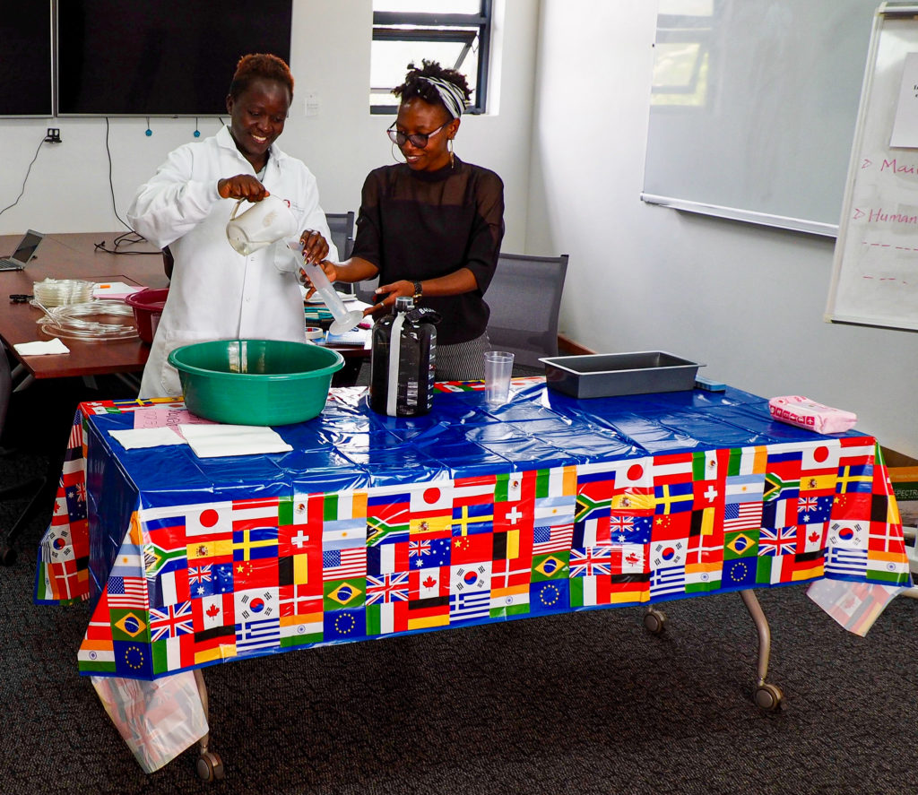 Salome Sijenyi (left) and Annick Uwitonze (right), MGHD ’20, demonstrate to students how to test lung capacity.