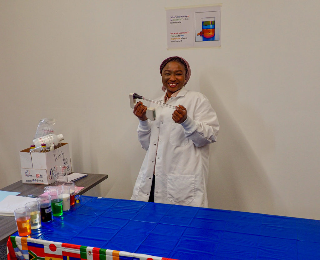 Dr. Chinelo Grace Okengwu, MGHD ’20, shows the G.S. Runaba students an experiment demonstrating the law of attraction and repulsion.